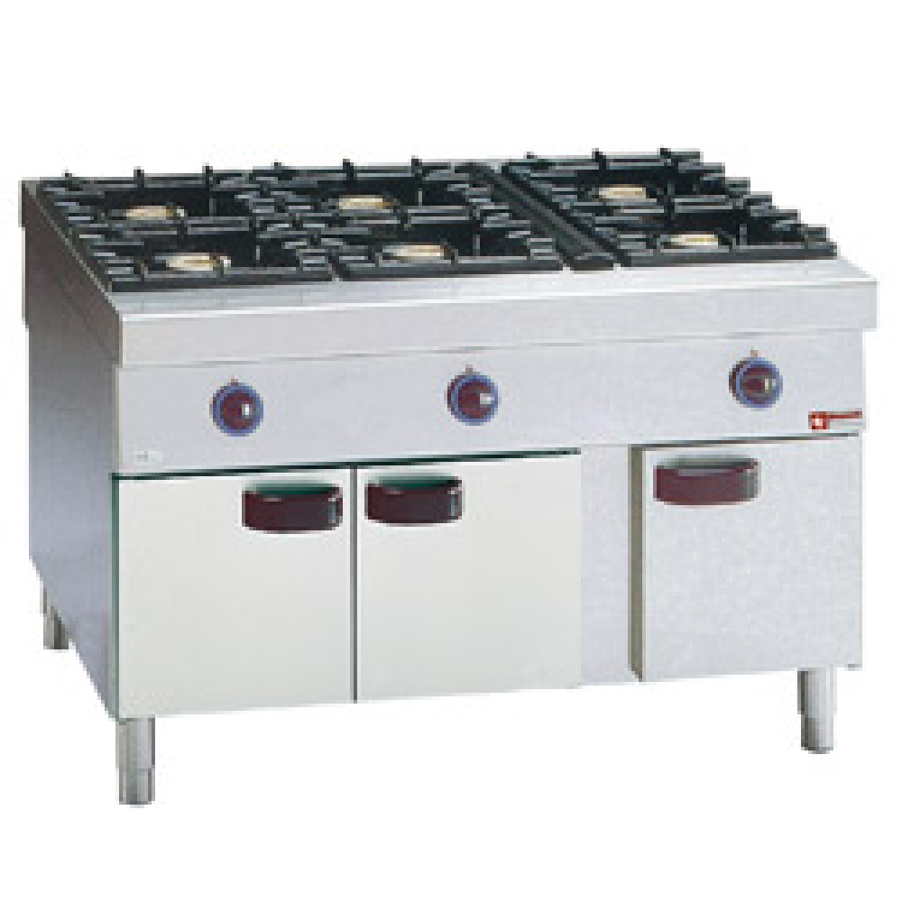Gas range, 6 burners, gas oven, neutral cupboard, “service hatch”