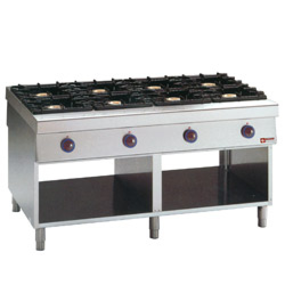 Gas cooker with 8 burners, 2 open cupboards, “service hatch”